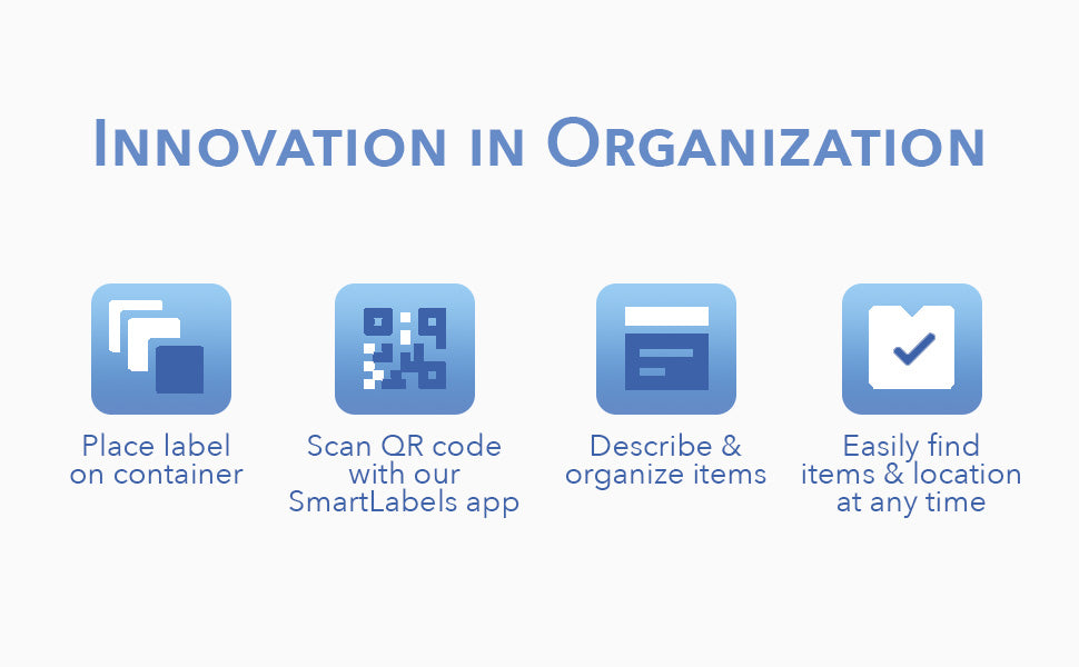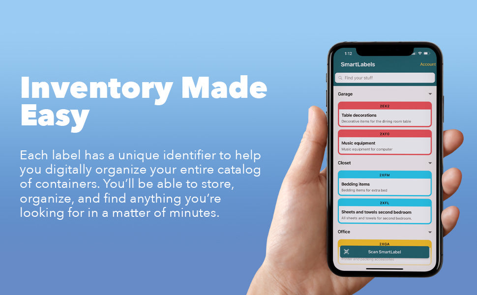 Easily organize your storage from your mobile phone. SmartLabels are QR codes that your phone can scan and manage. In the app, add photos, names, and descriptions of each item in your box. Later, when you want to find an item, search for it in the app to find its exact location, along with the label’s color and ID.